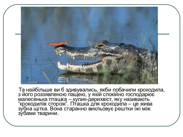 - Та найбільше ви б здивувались, якби побачили крокодила, з його роззявленою пащею, у якій спокійно господарює малесенька пташка – кулик-дерихвіст, яку називають “крокодилів сторож”. Пташка для крокодила – це жива зубна щітка. Вона старанно викльовує рештки їжі між зубами тварини.